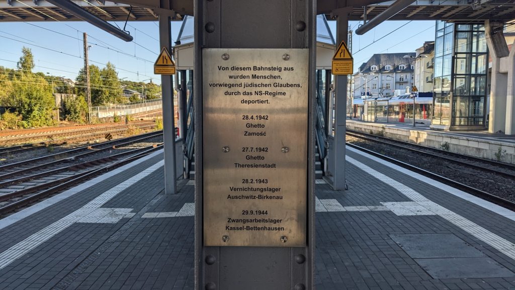 Hier begann für viele Jüd:innen aus dem Siegerland der Weg in die Konzentrations- und Vernichtungslager in Osteuropa. Sie wurden vom Gleis 4 am Siegener Hauptbahnhof aus deportiert. An diese Menschen erinnert seit Februar 1989 eine Gedenktafel. Fast niemand von ihnen überlebte.