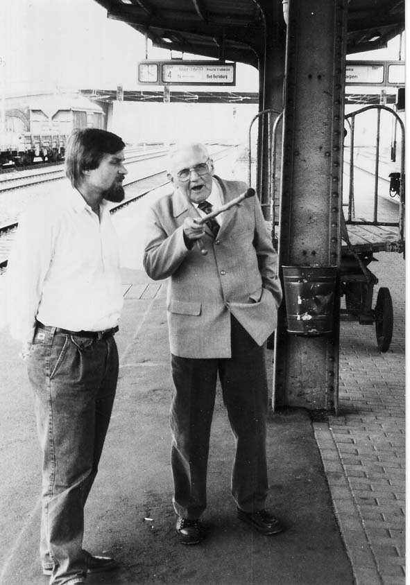 Wilhelm Fries zeigt Klaus Dietermann im Jahr 1988 den Ort der Deportationen aus Siegen und berichtet von seinen Erinnerungen. Er begleitete am 27. Februar 1943 seine jüdischen Freunde zum Bahnhof und verabschiedete sich von ihnen.