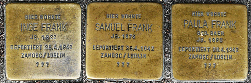 Der Kontakt mit der Familie Fries blieb jedoch auch nach der Deportation noch eine Zeit bestehen. Inge schrieb an Wilhelm Fries, dass sie in Zamosc in einem Pferdelazarett tätig sei. Was danach aus den Franks wurde, ist unbekannt. Vermutlich wurden Inge und ihre Eltern im Laufe der Zeit in ein Vernichtungslager deportiert und dort ermordet.